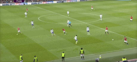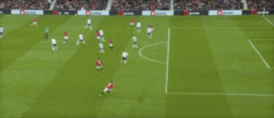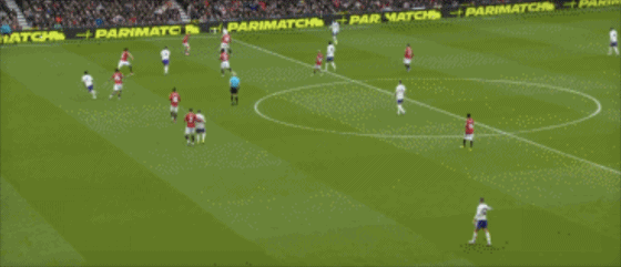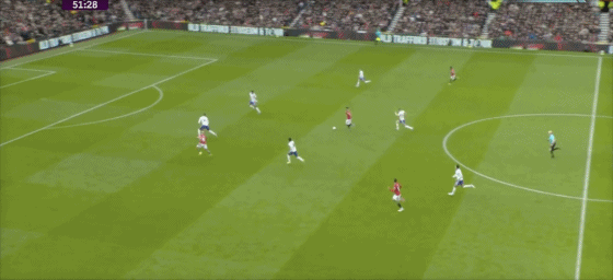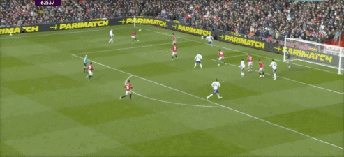 第43分钟,曼联反击,B费左路内切,禁区外右脚远射打偏。